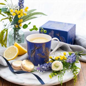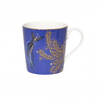 Entdecken Sie den bezaubernden „Butterfly Trails“-Becher, auf dem zarte Schmetterlinge über einen satten blau-violetten Hintergrund flattern, der von goldenen Blättern umrankt ist. Dieses edle Porzellanstück aus der Sara Miller London Kollektion zum 10-jährigen Jubiläum ist mit 22-karätigen Goldverzierungen versehen und macht Ihren Kaffee, Tee oder Ihre heiße Schokolade zu einem luxuriösen Genuss. Ideal für Sammler.